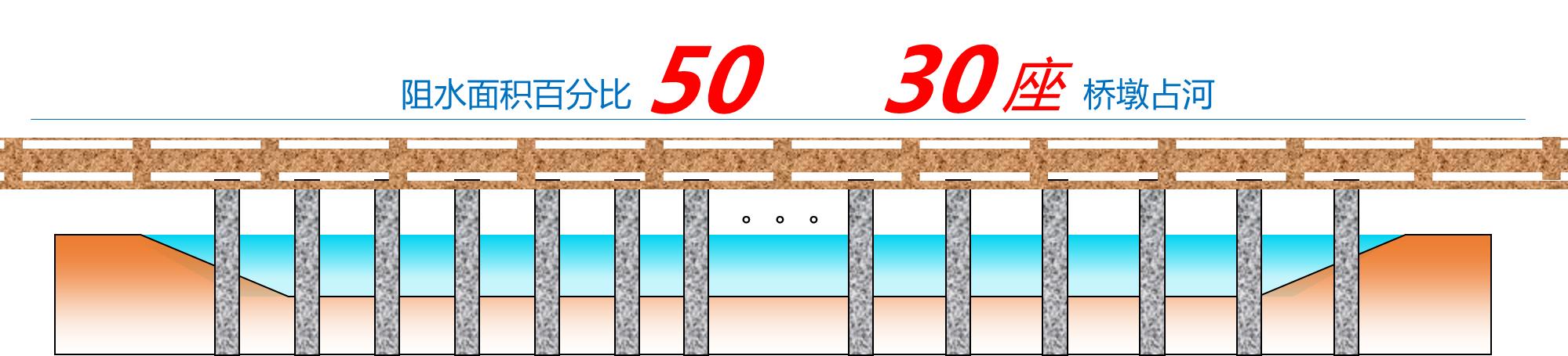 根據(jù)原設(shè)計,共有30座橋墩占用河道, 20年一遇設(shè)計水位條件下,橋墩阻水面積百分比達到50%以上,不符合《浙江省涉河橋梁水利技術(shù)規(guī)定》關(guān)于“跨越III級及以下堤防以及無堤防河道的橋梁的阻水面積百分比不宜大于6%,不得超過8%。”的要求