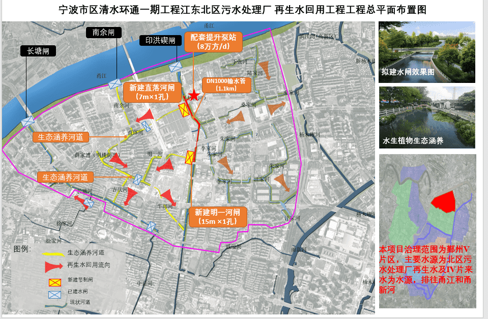 寧波市區(qū)清水環(huán)通一期工程江東北區(qū)污水處理廠再生水回用工程為增加河網(wǎng)水環(huán)境用水量,提升河網(wǎng)水體透明度及水體質(zhì)量,配套新建廠內(nèi)泵站1座,新建河道攔河鋼壩2座,新建再生水回用管道約1.1km,管道直徑約DN1000。水泵加壓后,通過(guò)引水管道將廠內(nèi)的水引至廠區(qū)外,與廠外的的輸水管道相接,管道沿后西河布置,并在直落河與明一河中設(shè)置兩個(gè)排口,出口各設(shè)置一座閥門井及一座攔河鋼壩。同時(shí)在直落河排口下游、明一河排口下游新建生態(tài)水源涵養(yǎng)區(qū)4.9km,配套岸線修復(fù)若干。